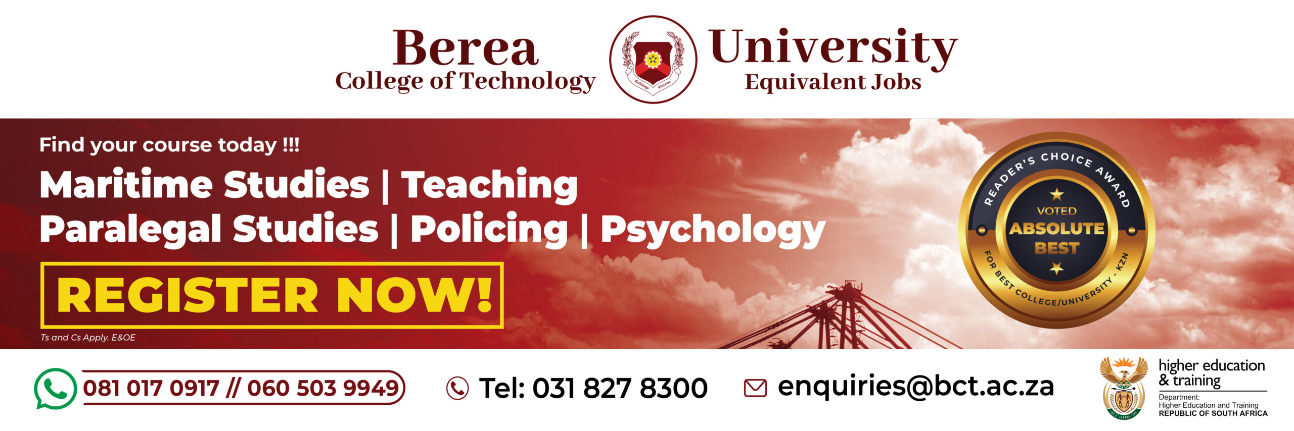 REGISTER NOW. Shape your own future before you end up building someone else's REGISTER NOW. Shape your own future before you end up building someone else's Name Surname Date of Birth Study Mode Full-TimeDistanceOnline Faculty Faculty of Information TechnologyFaculty of EngineeringFaculty of Management and CommerceFaculty of Hospitality and TourismFaculty of Education and LegalFaculty of Media and Creative StudiesFaculty of Transport and Logistics Select a Course Post Graduate Certificate in Education (PGCE) in Further Education and Training TeachingTrade Civil Engineering – Bricklaying and PlasteringTrade Civil Engineering – PlumbingTrade Mechanical Engineering – Motor TradeTrade Mechanical Engineering – Fitting & TurningTrade Electrical Engineering (Heavy Current)Trade Electrical Engineering (Light Current)Trade Electrical Engineering (Instrumentation Trade)National N Diploma Civil EngineeringNational N Diploma Mechanical EngineeringNational N Diploma Electrical Engineering (Heavy Current)National N Diploma Electrical Engineering (Light Current)National N Diploma Electrical Engineering (Instrumentation)National N Diploma Chemical EngineeringNational N Diploma Medical SecretaryNational N Diploma Public ManagementNational N Diploma Business ManagementNational N Diploma Management AssistantNational N Diploma Financial ManagementNational N Diploma Marketing ManagementNational N Diploma Human Resource ManagementNational N Diploma Public RelationsNational N Diploma Hospitality and CateringNational N Diploma Travel and TourismNational N Diploma Legal SecretaryOccupational Diploma Electrical Engineering (Heavy Current)Occupational Diploma Electronics TechnicianOccupational Diploma Mechanical EngineeringOccupational Diploma Analytical ChemistryOccupational Diploma Architectural DraughtingOccupational Diploma Construction Technology Civil EngineeringOccupational Certificate: Software EngineerOccupational Certificate: Cloud AdministratorOccupational Certificate: Cybersecurity AnalystOccupational Certificate: Internet-of-Things DeveloperOccupational Certificate: Artificial Intelligence Software DeveloperOccupational Certificate: Data Science PractitionerOccupational Certificate: Design Thinking Innovation LeadOccupational Certificate: Design Thinking PractitionerOccupational Certificate: Quality Test AutomatorOccupational Certificate: Software DeveloperOccupational Certificate: Computer TechnicianHigher Certificate Electrical EngineeringHigher Certificate Computers & AdministrationHigher Certificate Business AnalysisHigher Certificate Information TechnologyHigher Certificate AccountingHigher Certificate Human Resource ManagementHigher Certificate Marketing ManagementHigher Certificate Business ManagementHigher Certificate Public Administration and ManagementHigher Certificate ParalegalHigher Certificate Educational TechnologyHigher Certificate Digital MarketingHigher Certificate JournalismHigher Certificate Social Media and CommunicationHigher Certificate Supply Chain ManagementHigher Certificate Maritime StudiesHigher Certificate Logistics ManagementHigher Certificate Operations ManagementHigher Certificate Project ManagementDiploma: Information & Communications TechnologyDiploma: AccountingDiploma: Human Resource ManagementDiploma: Public Relations (with Journalism Specialisation)Diploma: Hospitality ManagementDiploma: Psychology – General, Developmental and IndustrialDiploma: ParalegalBachelor of Science (BSc): Information Technology (I.T)Bachelor of Commerce: Information SystemsBachelor of Commerce: AccountingBachelor of Commerce: Human Resource ManagementBachelor of Commerce: Supply Chain ManagementNational Certificate: Information TechnologyCertificate: Graphic Web Design and MultimediaOther School Attended Parent Email Your Email Cell Phone Number WhatsApp Number Title —Please choose an option—MrsMr Grade Parents Mobile Province —Please choose an option—Eastern CapeFree StateGautengKwaZulu-NatalLimpopoMpumalangaNorthern CapeNorth WestWestern Cape Physical Postal Address Physical Post Code